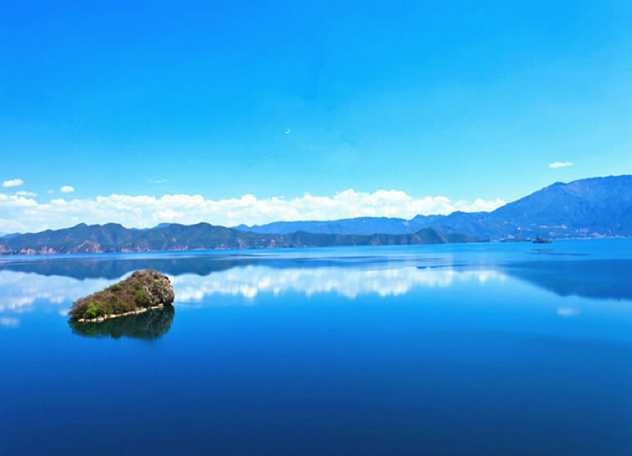 天空湛蓝,几条薄云型如丝带,越拉越远,湖面如镜,看上去更加湛蓝。云谈风轻,湖光山色,也不知让多少游人在此迷醉。泛舟而游,船浆打破湖面,荡起层层涟漪。水清澈无比,不知藏着泸沽湖多少年的沉淀。平静的湖面上,划过一叶孤舟。湖边的水面上,漂浮着一片片白色的花瓣。