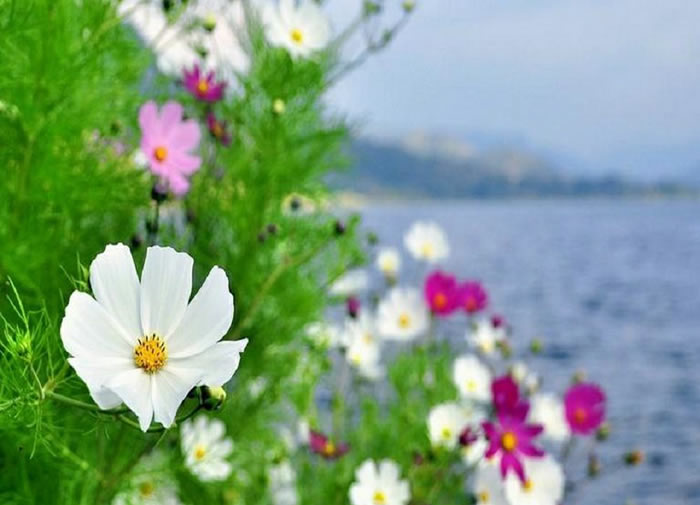 泸沽湖畔的山麓,平淡无奇,大多是云南随处可见的松叶林。却更加衬托出湖水的清幽。在湖边的一角,生长着一片片不知名的小花。花儿红白相间,苗条而轻盈,随着湖水的微波翩翩起舞。不时也跌落几片于水中,孤独的飘零在水面上。湖水中突然游来一群鲫鱼争相抢吃水草。大大小小,却都快如闪电,你来我往,在水里嬉戏,休闲的享受着这温暖的泸沽湖。水上和水下均有不同的世界,共享这片美好的家园。