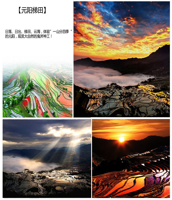 温馨提示:1、元阳属哈尼族集聚地,请尊重当地民族礼仪和风俗习惯。、今日需要早起看日出(约5:30左右),请大家头天晚上早点休息!2、老虎嘴景区的日落观赏最佳时间是18:30分左右,请您自备一些充饥食品。